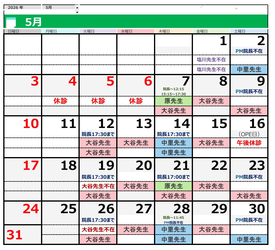 ※院長先生は毎日(午前・午後)診療しています。(不在日・受付時間変更日のみ記載)